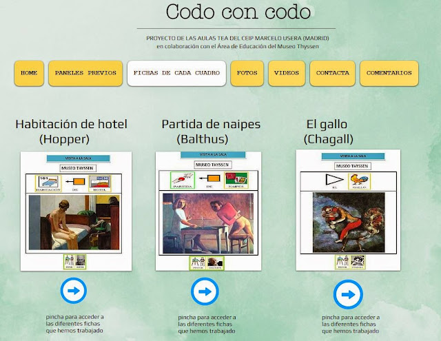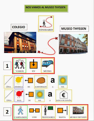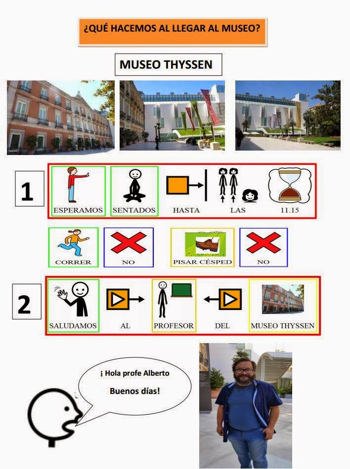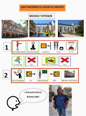 Me encanta la idea que subyace bajo todo el proyecto. Y es que siempre he defendido que tenemos que complementar la señalización de la fachada de los edificios y establecimientos con la creación de tableros de comunicación, documentos impresos, guías, dibujos, etc., que les expliquen a nuestros chicos cómo llegar a ese espacio, cuáles son las normas de comportamiento, qué se puede ver, en qué participaremos, etc. Y en este caso, además, se añaden explicaciones con pictogramas sobre los cuadros más importantes.